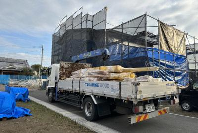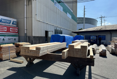 加工と仕上げの済んだ構造材が現地に到着しました。