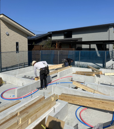 土台が碁盤の目状に敷き終わると断熱材入れの工程へ。