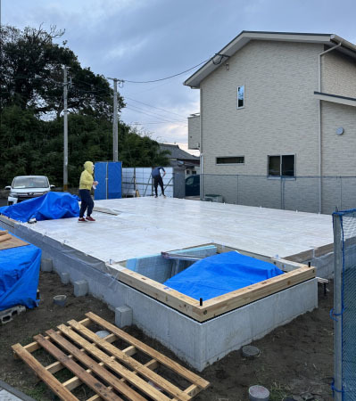 検査が終わると型枠を設置しコンクリートを2回に分けて打設します。