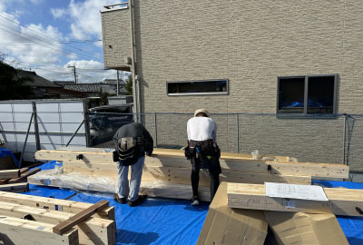 取付と加工が終わると分厚いブルーシートで養生をして上棟に備えます。
