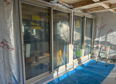 床の防水工事が完了したテラスにも掃き出し窓を取り付けへ。