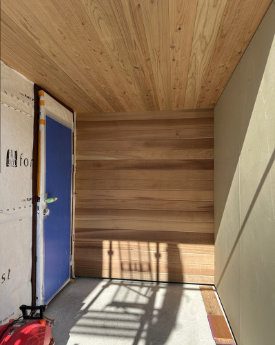 玄関廻りでは壁にもレッドシダーをふんだんに使用しました。