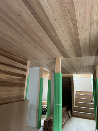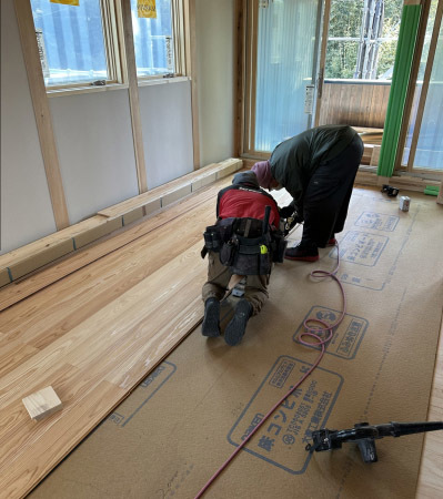 無垢の杉板を1枚ずつ丁寧に張り進めると木特有の良い香りが広がってきます。
