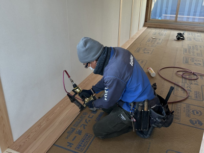 内部では床張りを進めます。