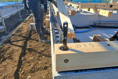 まずは先日仕上がった基礎と土台を金物でしっかりと固定していきます。