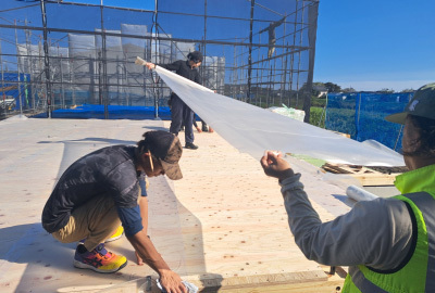 床パネルの敷き後、専用の保護シートを隙間なく貼り養生を施していきます。