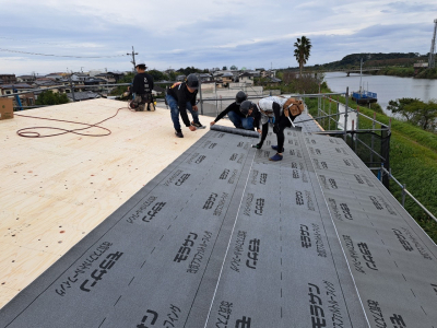 夕方には屋根まで到達、屋根下地も丁寧に敷いていきます✨