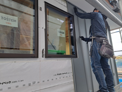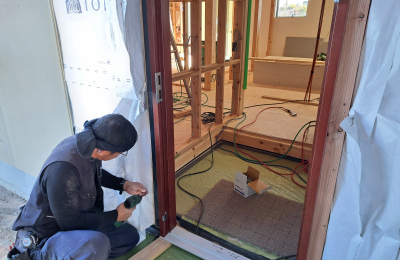 躯体検査の前に玄関ドア・サッシの取付けも行います。