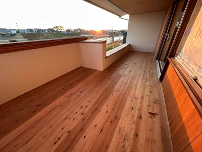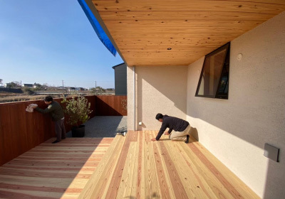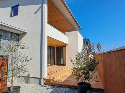広がりを見せるwooddeckと絶妙な高さのwoodfenceが一段と落ち着くプライベートな空間へと。