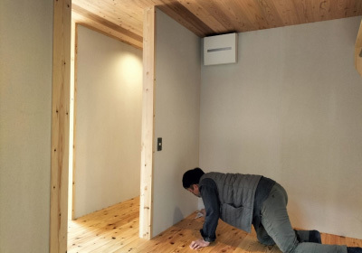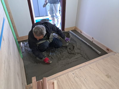 玄関土間では左官職人さんによるモルタル仕上げや、