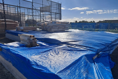 さらに厚手のブルーシートで二重の養生を施し土台敷きの全工程が完了!
