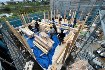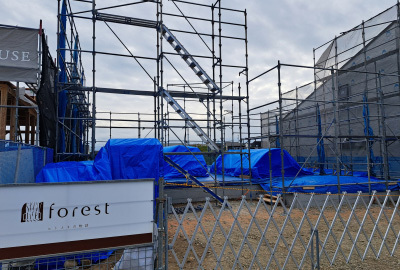 後日、構造材の搬入・仮設足場の設置を行い建て方へ向けての準備が全て整いました。