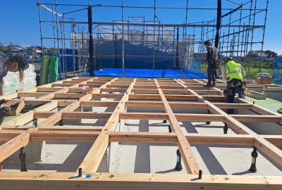 基礎が完成すると、1階床の骨組みをつくります(土台敷き)