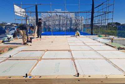 断熱材を床組みの間に敷きこみ、床下地を設置すると土台の完成です。
