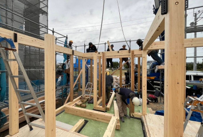 (建て方時はちょうど太陽が隠れていましたが...☁ 完成をお楽しみに!)