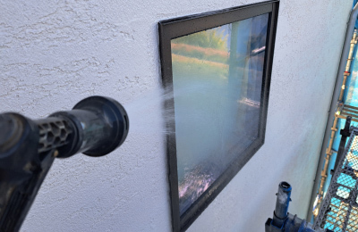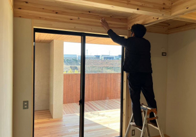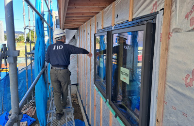 サッシ工事完了後は第三者JIOによる躯体検査を実施。 外部の防水状況からチェックを行います。