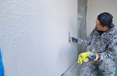 吹付けてコテで押さえる工法。 コテの押さえ加減で絶妙な陰影を表現していきます。