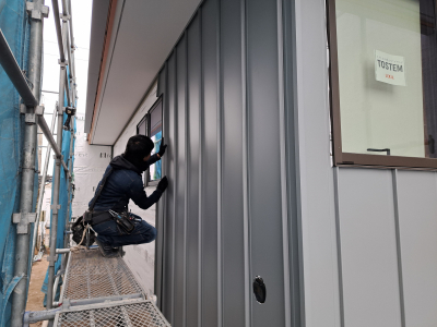今回、立平鋼板のマットなグレー色を採用。 通常屋根で使う立平の鋼板。壁で使うためひと手間をかけ納めていきます。