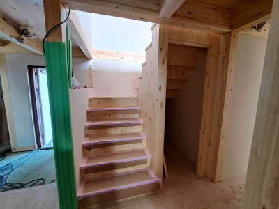 階段の造作工事。 棟梁の腕一本で一枚板から加工を施し組み上げていくオリジナル階段。