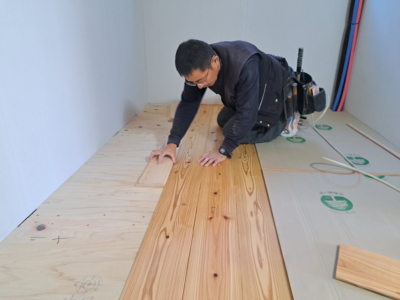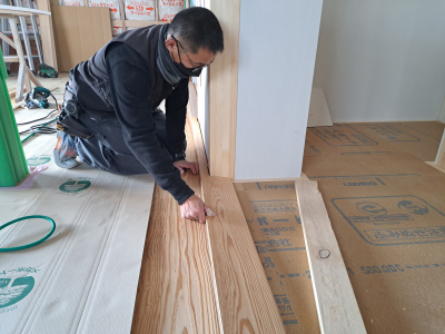 内部では棟梁による浮造りの床仕上げ工事へ。