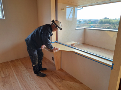 窓際の造作デスクも完成へ、自然塗料を施し美しい仕上がりに。