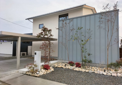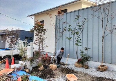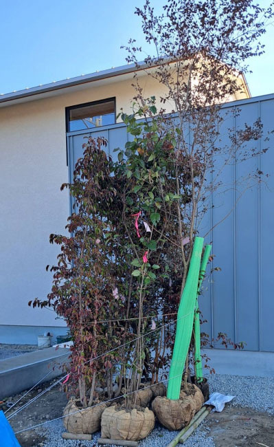 外構の仕上げは植栽工事。山から選んできたお気に入りの木々を配置していきます。