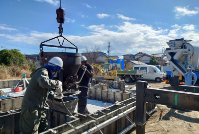 バイブレーターで加振しながらコンクリート内の気泡を抜き、 隅々までコンクリートは行き渡るようにします。