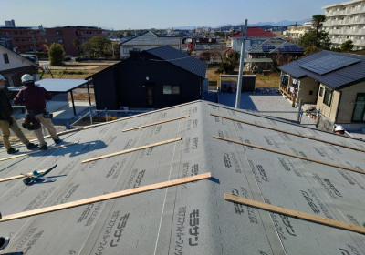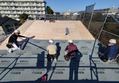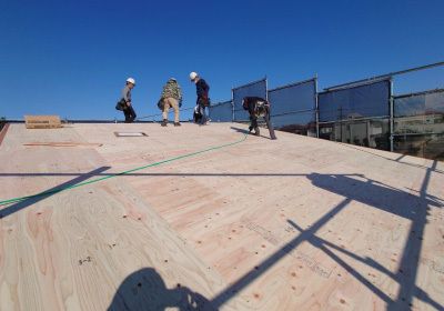 屋根の最後の仕上げは、構造用合板にルーフィングでしっかりと押さえ 屋根下地をつくっていきます。 こ