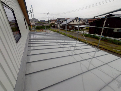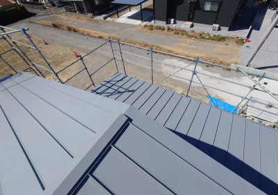 軒先から棟まで継ぎ目のない屋根材が直線的に広がります。
