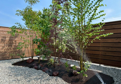 ポツンと建っていた建物も、ウッドフェンスと植栽が入ると敷地全体が締まり 建物がより引き立ちます。