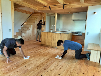 完成お披露目を終えたHOUSE Kの現場。 お引渡前の最後の磨きを行いました。