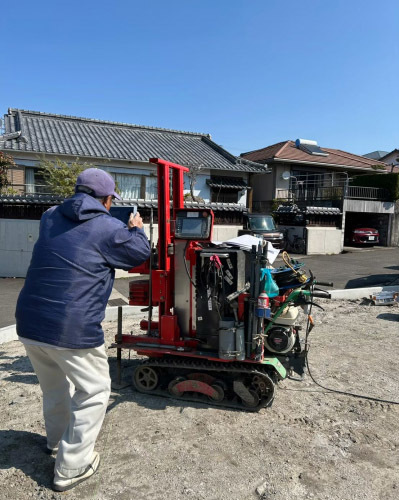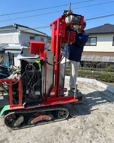 金属製のロッドを回転させ垂直に沈めていき 沈み方や反応をみながら土質や地盤の良し悪しを計測。
