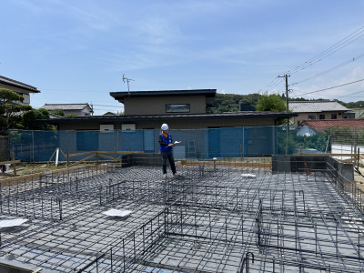 後日、配筋作業を行いました。 梅雨時期とは思えない程に晴れ間が続き、厳しい暑さです。