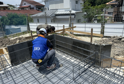 配筋作業が終わると第三者機関による『配筋検査』を実施。 設計通りに配筋されているか、施工方法に不備は無いかなど細かく確認します。