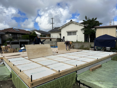 続いては土台間に断熱材を入れていきます。