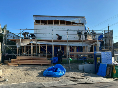 最後はブルーシートで建物全体を丁寧に包みます。お家の全貌が現れ建て方工事完了です!