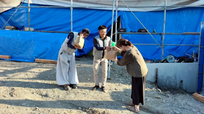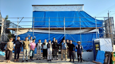 足場の組まれた現場に早朝から大工さんが集結します。 朝一番から大工さんたちが手際よく工事を開始しました。