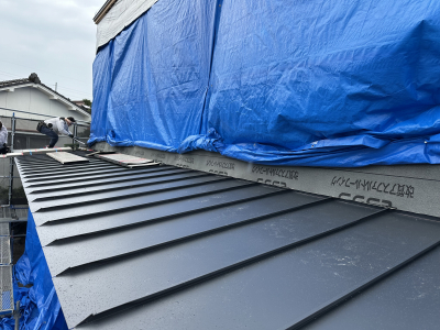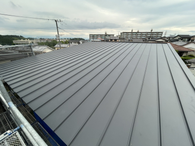 縦ハゼ葺きとは屋根鋼板を継ぎ目なく縦方向に葺いていく工法で 高い防水性と耐久性が特徴です。