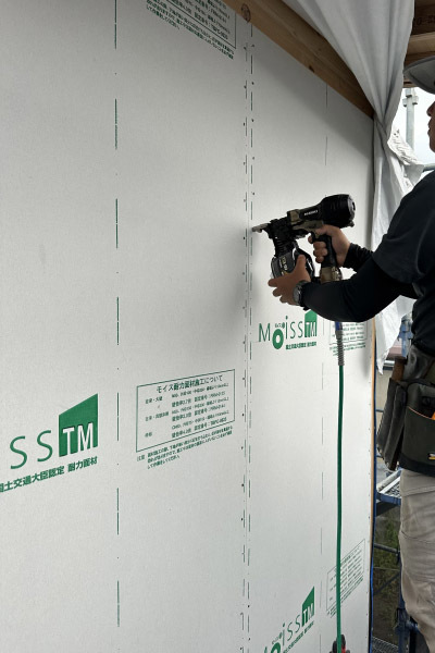 外壁部分では構造用合板張りを実施中。