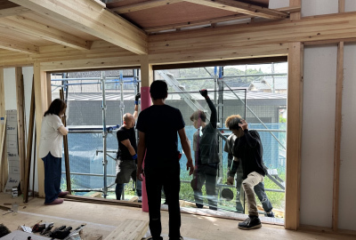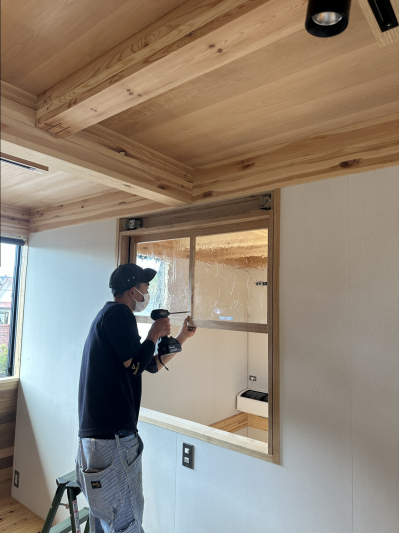 天候にも恵まれ順調に作業は進みます。 内部では特別製作の室内窓を取付。