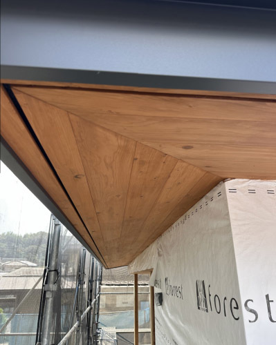 色の明るさを微調整した軒天との相性も良くとても上品な仕上がりです。 防水処理を施して磨きを行えば外部足場の解体へと進みます。