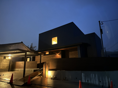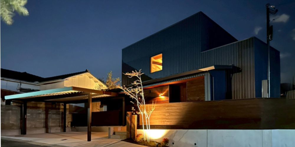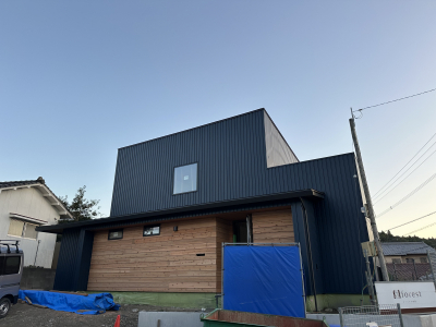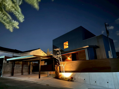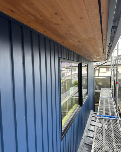 ネイビーのガルバリウム外壁と杉の鎧張りアクセントのバランスがとても良いですね。