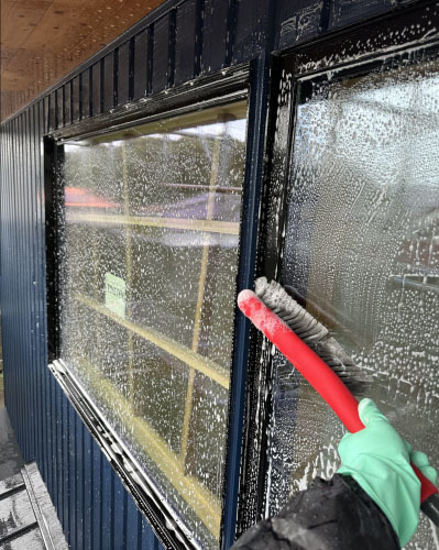 サッシ廻りもブラシを使って丁寧に洗います。