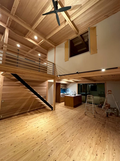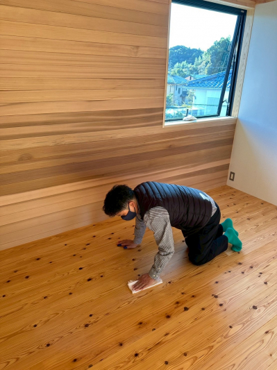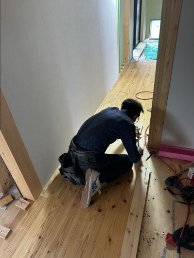 床に無垢の杉板を張り進めていくと 室内はより一層、木の香りに包まれます。
