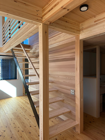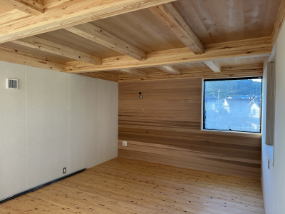 居室の壁にはアクセントでレッドシダー材を張りました。