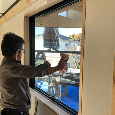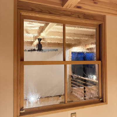 木製サッシの障子にはガラスを搬入します。