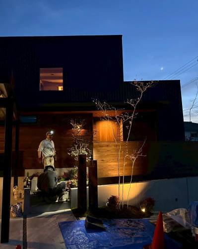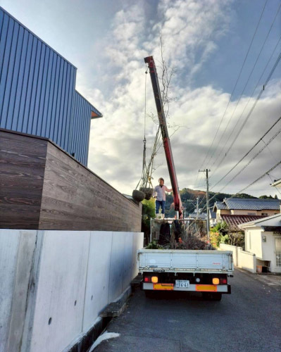 外構の仕上げは植栽工事。山から選んできたお気に入りの木々を配置していきます。