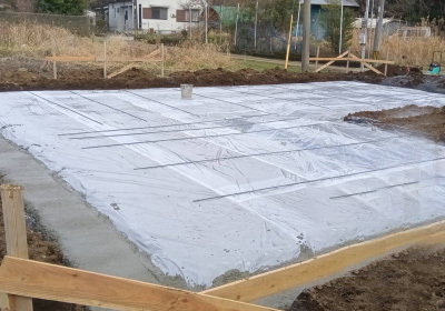 転圧作業が終わると基礎防湿シートで綺麗に隙間なく地面をラッピングする事で 地面からの湿気やシロアリの進入を防ぎます。
