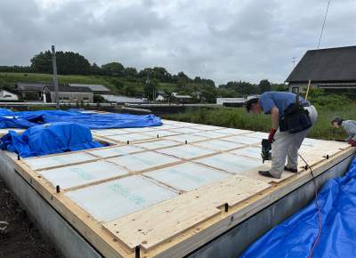 続いては床の断熱材を敷き詰め、その上に構造用合板を並べていきます。