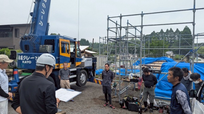 しっかりと朝礼をし、作業内容の確認を行います。 準備万端、建て方作業の始まりです!